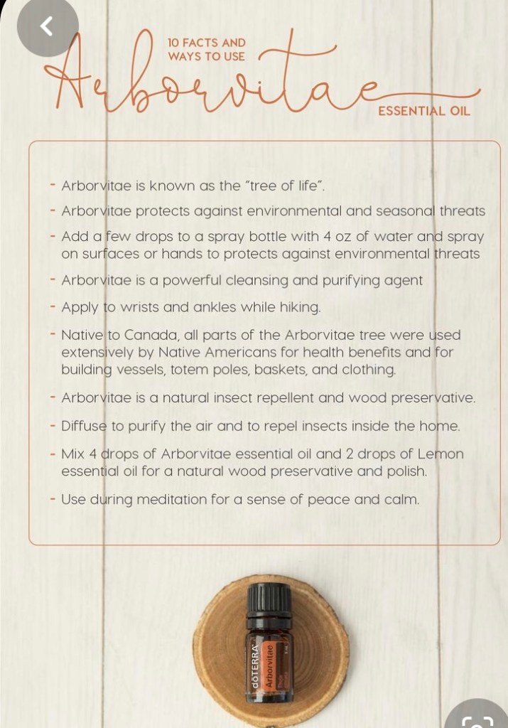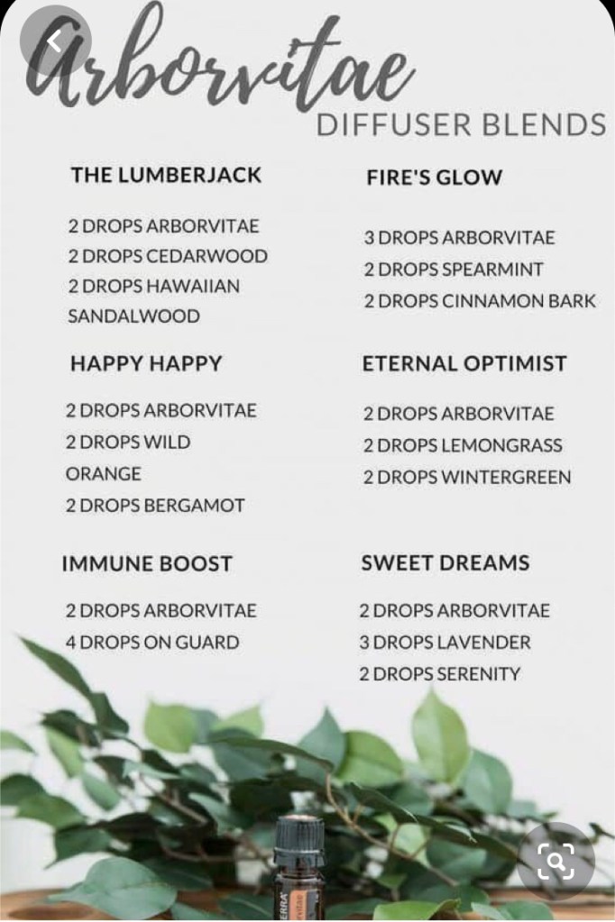 - Mix 4 drops of Arborvitae essential oil and 2 drops of Lemon essential oil for a natural wood preservative and polish.